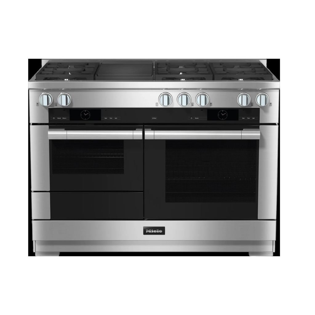 The Miele HR 1955-3 G DF GR is a 48″ professional-style dual fuel range that combines a powerful gas cooktop with a precise electric oven and integrated speed oven, delivering restaurant-grade performance in a refined stainless Clean Touch Steel finish.
